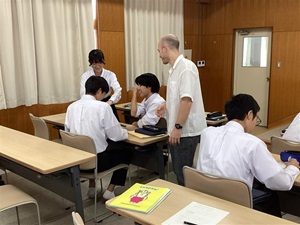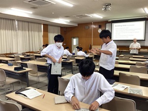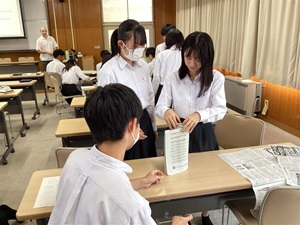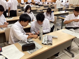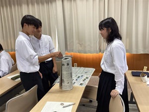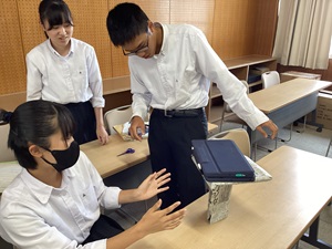 理数探究科1年生では、週に1回ALTの先生の授業を行っています。トピックは毎回興味深いものばかり!生徒たち一押しのプロジェクトは、耐震性を考えるため、新聞紙とセロテープ2本を使って、iPadを支えられる柱を作ろうというものでした。最初に仮説を立て、レポートに英語で書き込みます。イラストも駆使して考えを深めたら、いざ実践!ハリソン先生の質問に答えながら制限時間内に作れるかとドキドキしているようでしたが、大盛り上がり。ほかのグループはどんなものにしているのか、など最後まで興味津々でした。