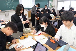 その場所に生育する植物の様子について学びます。そこで、「校内にどんな植物があるのか、調べてみましょう」というテーマで、フィールドワークを行いました。1時間目は、校内にある植物の標本(葉)とその姿の写真を採集。2時間目は、その情報をもとに採取した植物の同定を行いました。1チーム3~5人の班をつくり、班での活動となります。どの木にしようかなぁ、この野草にしようかなぁ、班のみんなで相談して目的の標本を選びます。普段見慣れている風景ではありますが、改めて観察してみると、校内にもこれだけたくさんの種類の植物が植栽されていたり、自生していたりするのだと気づきます。