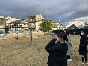 当日は、府内の他校の生徒を含め約10名が集まり、気象観測の現場を間近で見学しました。気象台の職員の方々の案内のもと、まず「露場」と呼ばれる気象観測のための専用エリアを訪れました。この露場では、気温や湿度、風速などを正確に測定するための機器が設置されており、その仕組みや運用方法について詳しく説明を受けました。普段は見ることのできない観測機器を間近で確認できたことで、参加した生徒たちは、気象観測の重要性と精密さについて理解を深めることができました。