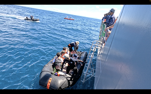 冠島はオオミズナギドリの集団営巣地として国の天然記念物に指定されており、通常上陸は禁止されています。本校理数探究科では、希望する生徒が舞鶴市や環境省からの特別な許可を得て、冠島に上陸し、冠島調査研究会のオオミズナギドリの標識調査補助を行いながら、本校生徒の探究テーマである「オオミズナギドリの日周行動」について、毎年データを取っています。 今年度は本校からの希望者が多く、6月の調査に加えて8月の調査にも参加しました。