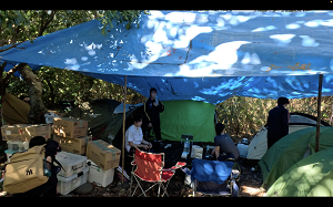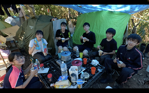 冠島は無人島であるため、水を含めた生活物資を持ち込み生活します。原生林の一画にテントサイトを設営したり、様々な工夫を凝らしてタープやテントをはり、快適に生活できる空間を作ったりすることは、現代の生活に慣れている我々に多くの気づきを与えてくれます。