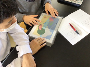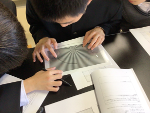 モアレと呼ばれる事象を実験を通して体験しました。西川先生が作成されたワークシートを動かすと歯車が動いたり、写真が見えると生徒からは驚きの声が上がりました。