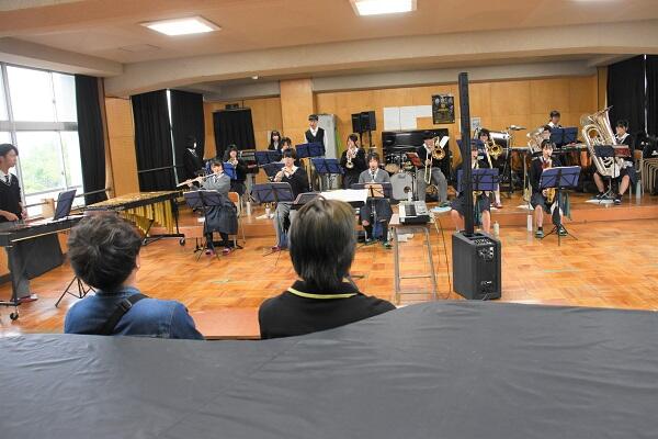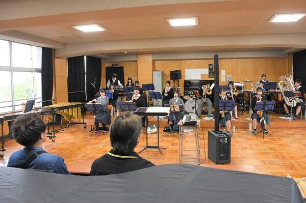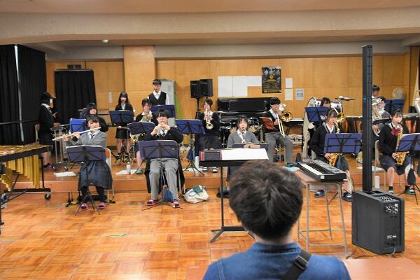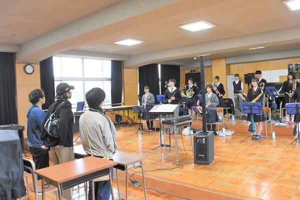 始めにバンドの録音音源に合わせて、吹奏楽部が一緒に演奏しました。メンバーの皆様にはとても感動いただき、喜んでいただけました。その後、演奏のことや配置など打ち合わせしながら、演奏しました。