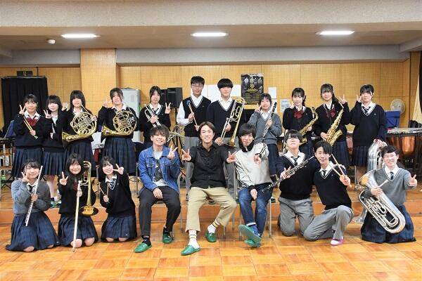 本校卒業生3名がメンバーのロックバンド「LOCAL CONNECT(ローカルコネクト)」の3名に、本校音楽室に来ていただき、11月29日の吹奏楽部とのコラボ演奏に向けた練習会を開催しました。