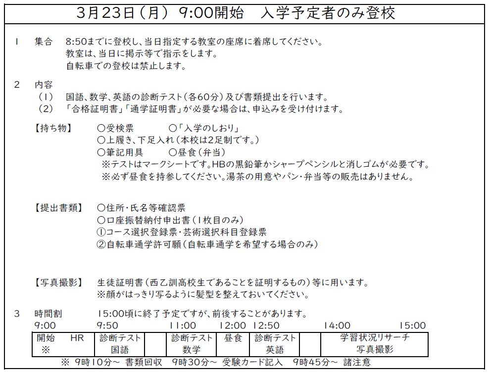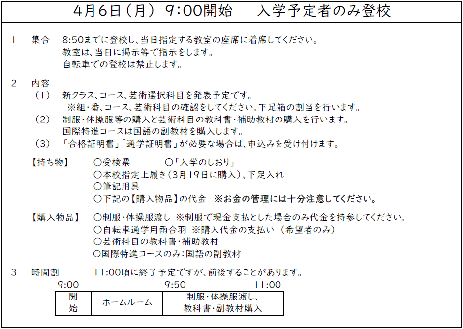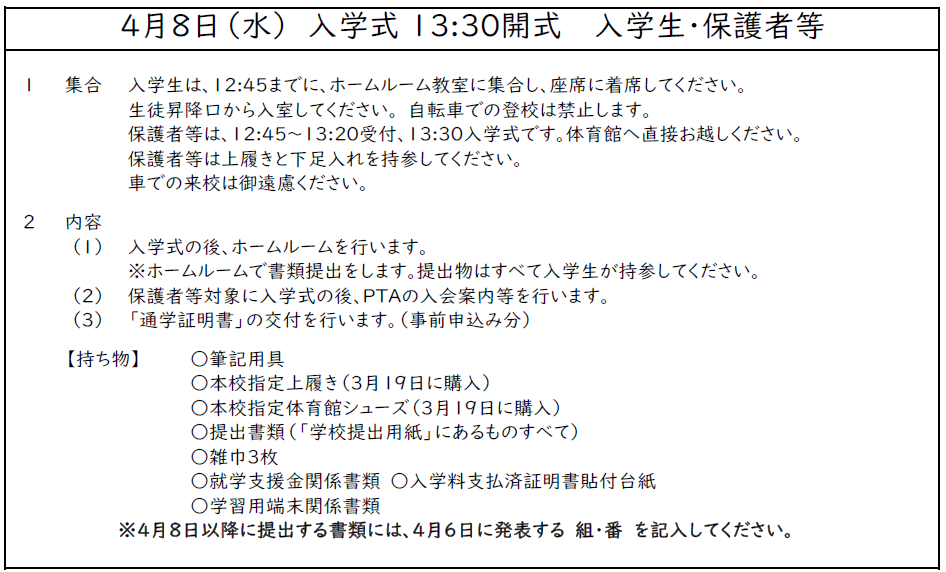 本校の令和8年度 入学予定者の登校日・入学式についてです。御確認ください。