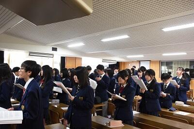 その後、視聴覚教室にて各分掌の先生から本校の学習や進路・生活の仕方についての説明を受け、校歌の練習も行いました。