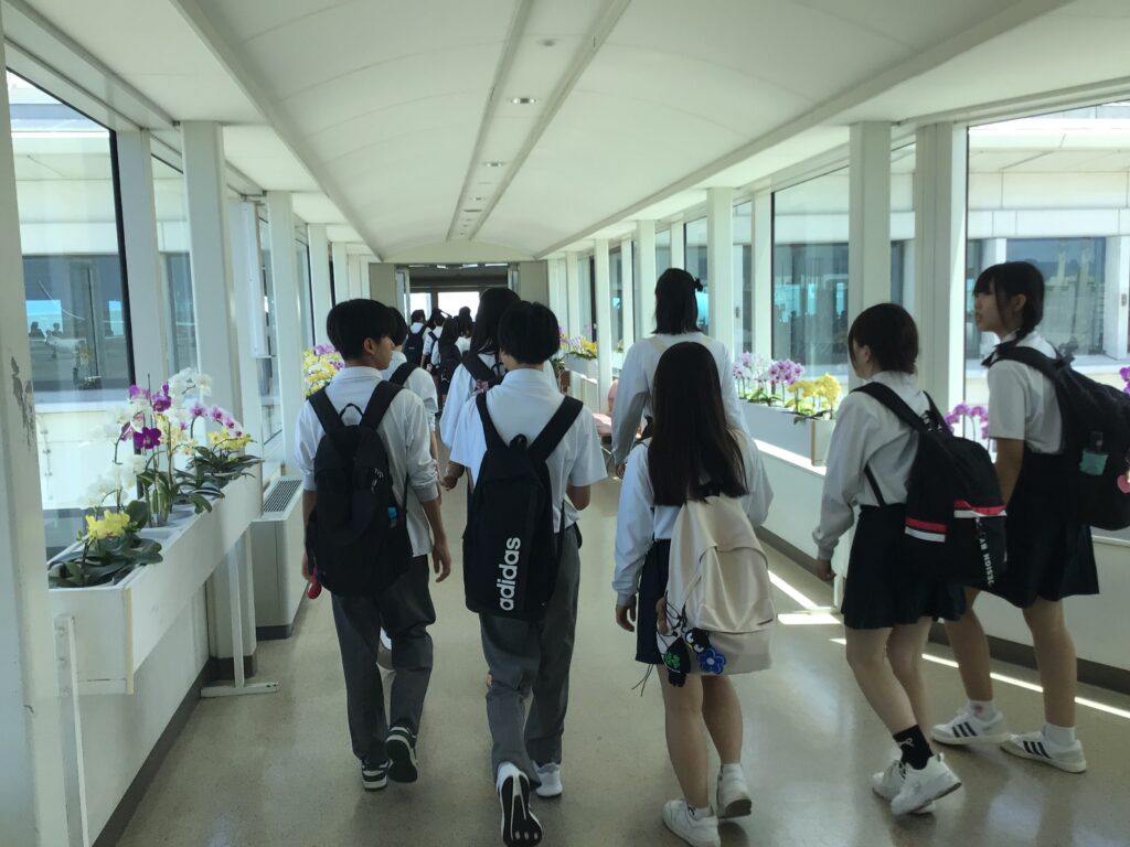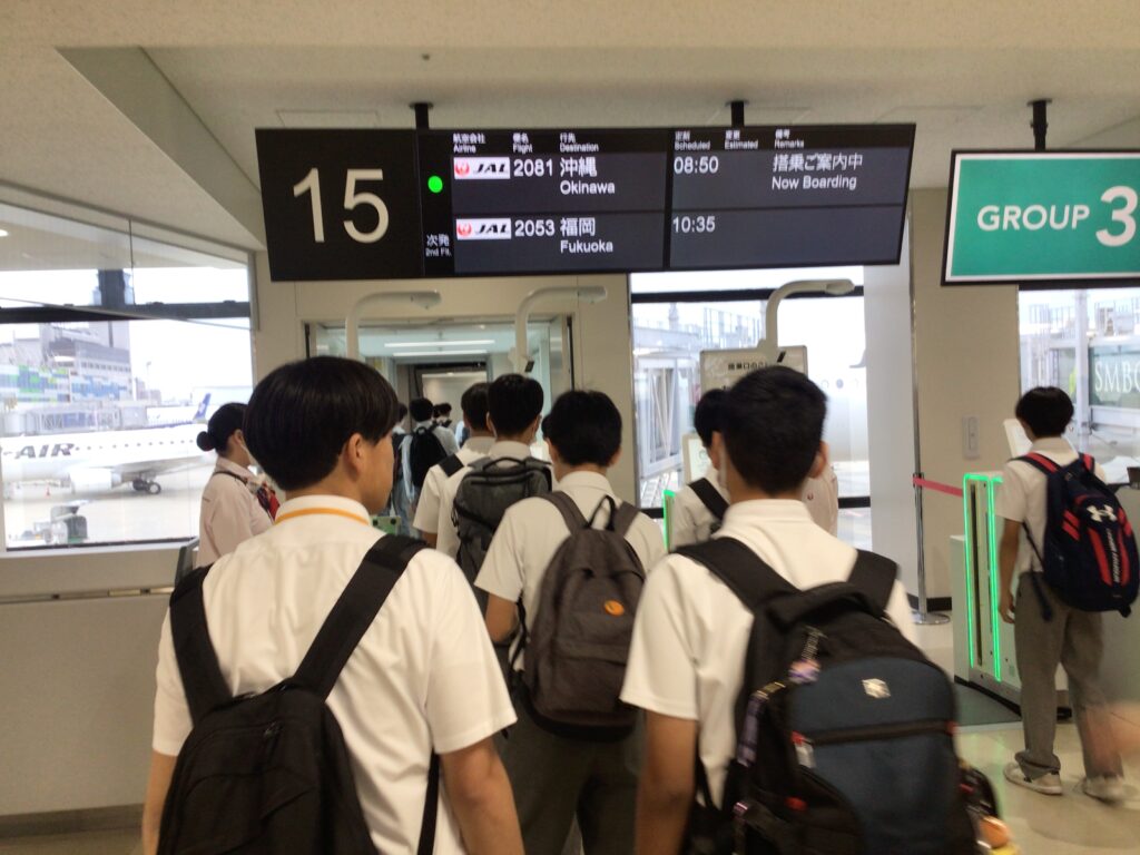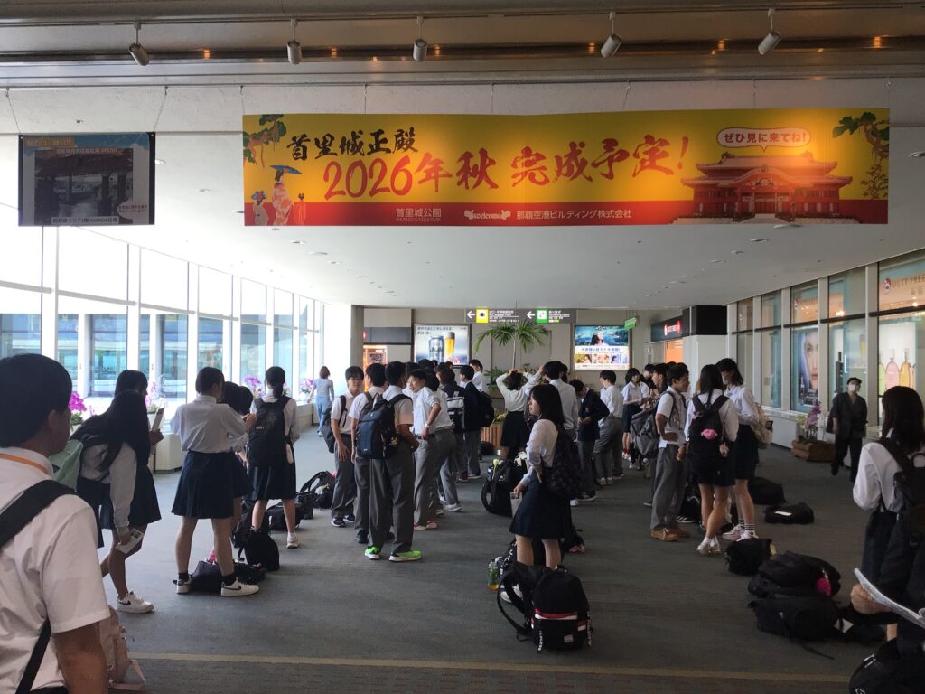 3年生沖縄体験学習1日目② 修学旅行 Twitter Facebook はてブ Pocket LINE コピー 2026.01.09 2025.06.08 8:50頃伊丹空港を離陸し、11:00頃那覇空港に無事到着しました。飛行機の離陸・着陸に驚きの声があがっていました。 現地の天気は晴れです!沖縄の気候に早速驚いている様です。 閲覧数: 439