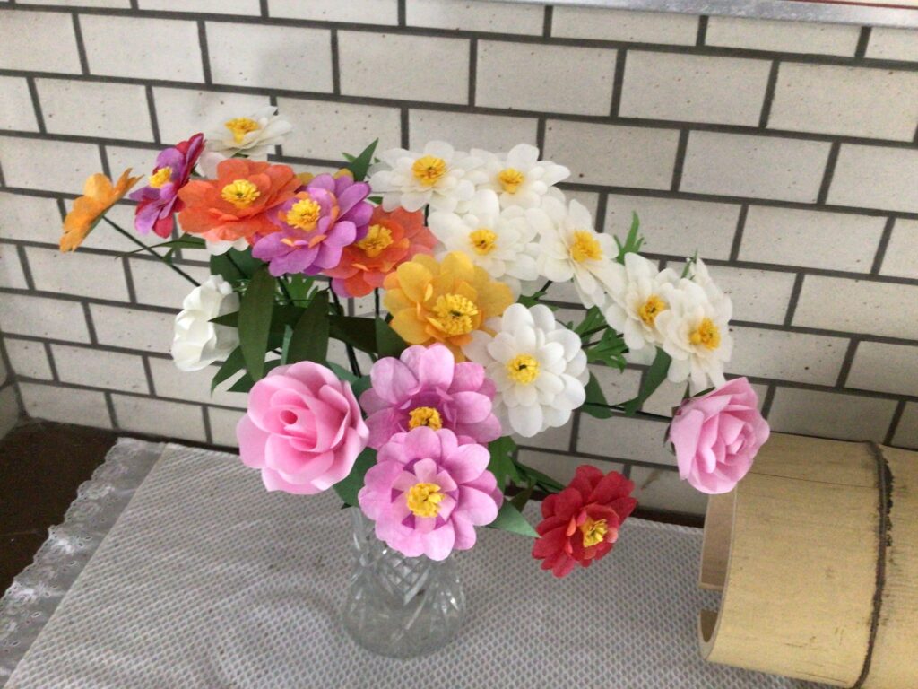 学校生活図書ボランティアさんは、地域の方で構成され、毎週金曜日に学校で活動してくださっています。季節や行事にあう作品を作り、校内を華やかにしてくださっています。今回は、紙で作った造花の花をたくさん作ってくださいました。正面玄関や階段の踊り場、図書室など、どこにあるか探してみてください。外だけでなく、校内でも花いっぱい運動を楽しみましょう。