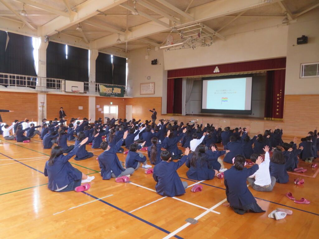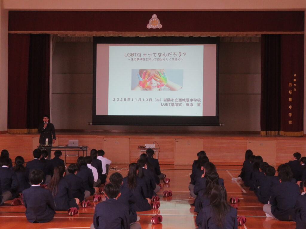 行事11/13(木)、1年生では人権学習「LGBTQ+」について、今年度も講師として藤原直さんに来ていただき、ご講演をしていただきました。