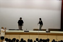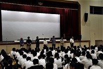 10月16日(木)文化祭取組が始まりました。1年生は合唱、2,3年生は演劇の発表ですが、この日は「劇団衛星」という京都を拠点に、既存のホールのみならず、寺社仏閣・教会・廃工場等「劇場ではない場所」で公演を行われている皆様に演劇を見せていただき、その後は2年生が各教室でシアターゲームや演劇指導を受けました。これからの演劇の発表に向けたよい体験をすることができました。