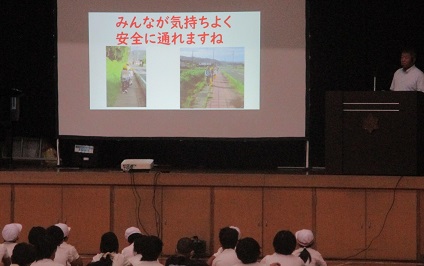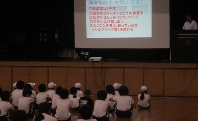 10月の学校朝会を行いました。内容は登下校のことです。登校時に子どもたちが歩道いっぱいに広がり、通行者(ヘルプマークをされている方)に迷惑をかけるということがあり、子どもたちに指導しました。①歩道は1列で端によって歩く ②高学年はリーダーとして自覚をもち、低学年は間をあけずついていく ③注意をしあう ④人のことを考え、困っている人を助けるということを伝えました。また、自分のしたことを正直に言うことの大切さについても話しました。「自分に都合の悪いことを言うと怒られたり、家の人をがっかりさせたりするかもしれません。でも、嘘をつくと何度も同じ嘘をつくことになったり、人から信用されなくなったりするかもしれません。正直にいうのは、勇気がいることかもしれませんが正直に言える人になってください。」というような話をしました。