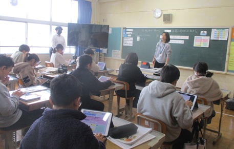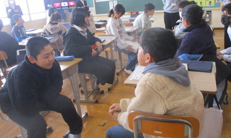 東八田小学校6年生との合同授業 子どもたちや学校の様子 2026.01.26 6年生が外国語科の授業で東八田小学校の6年生と合同授業を行いました。中学校に入学する前に合同で授業を行い、お互いの授業の様子を知ることでスムーズに中学校の授業に移行できるようにすることをねらいとしています。子どもたちは、お互いによい刺激を受けたようです。