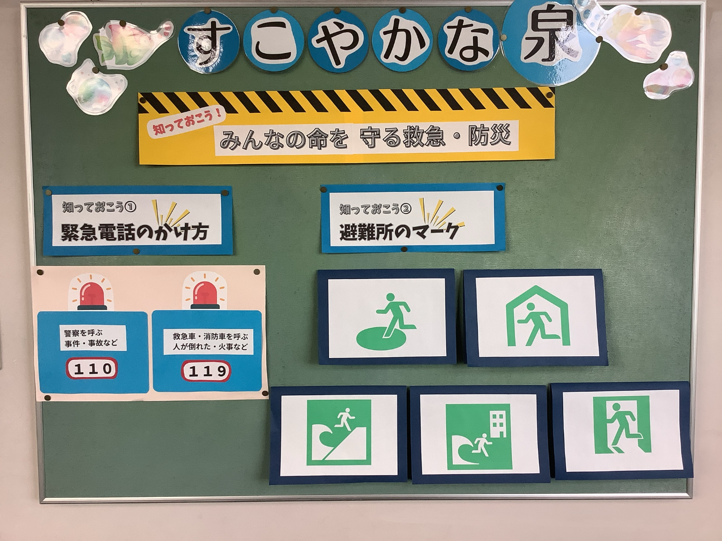 すこやかな泉 Twitter Facebook はてブ Pocket LINE コピー 2025.09.29 9月の保健室前の掲示板です。9月は防災月間のため、「みんなの命を守る救急・防災」について掲示されています。日頃から防災を意識し、何かあったときの行動を確認してほしいと思います。