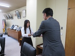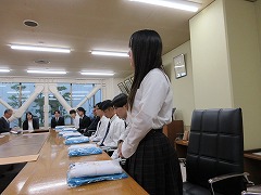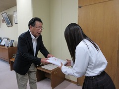 10月10日(金)、2年生の木村愛蘭さんが福知山市役所で行われた市長激励会に出席しました。木村さんは、10月19日(日)、女子ジャベリックスロー京都府代表として、三重県伊勢市で実施されるJOCジュニアオリンピックカップ第19回U18第56回U16陸上競技大会に出場予定です。京都府の代表として、また、本校の代表としての活躍を期待しています。