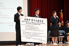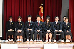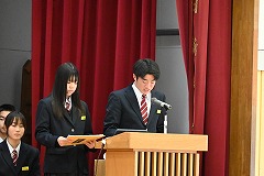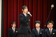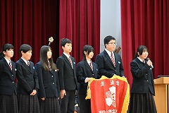 12月19日(金)、生徒大会・生徒会認証式・引継式を行いました。令和7年の生徒会役員が1年間の総括を行ったあと、校長先生から認証書を受け取りました。その後、生徒会旗を令和8年の生徒会役員に手渡し、その役割を引き継ぎました。また、引継式後には、伝達表彰を行い、2学期の仲間の頑張りを称え合いました。