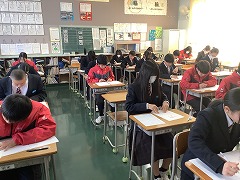 2分の1入試 Twitter Facebook はてブ Pocket LINE コピー 2026.02.16 2月10日(火)、多くの3年生が私立高校入試に向かいました。この時期に合わせ、校内では2年生が、3教科の模擬試験を行う「2分の1入試」に取り組みました。希望進路実現に向けて、全校一丸となって、学力向上を目指しています。