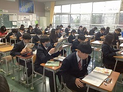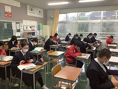 2月25日(水)~27日(金)、1、2年生が学年末テストに取り組んでいます。3年生は通常校時で授業を行っていますが、1、2年生が最大限の力が発揮できるように、大変静かに学校生活を送っています。「学習の日新」を合い言葉に最後まで勉強に取り組んでいます。