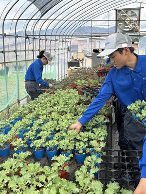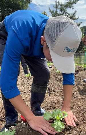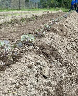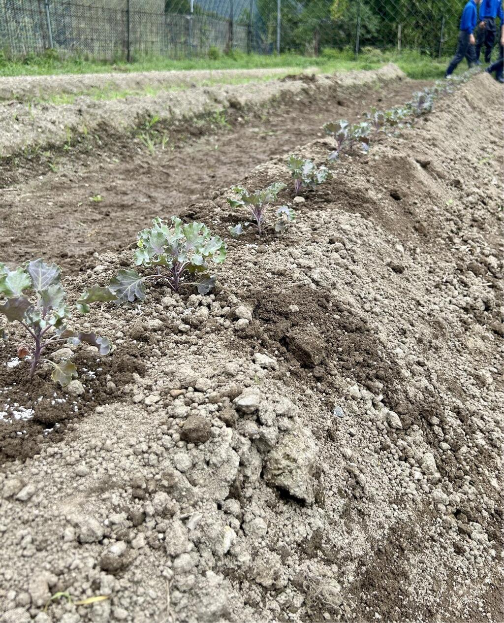 夏休みに種をまき、鉢上げをしたハボタンを畑に定植しました。1つのうねに約50本の苗を植え、早いチームは1時間で作業を終わることができ、生徒の成長がみられました。このハボタンは農芸祭で販売を予定しています