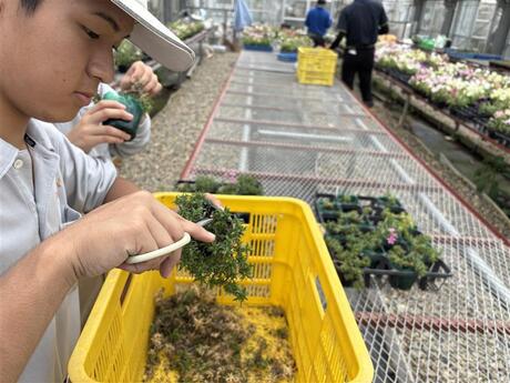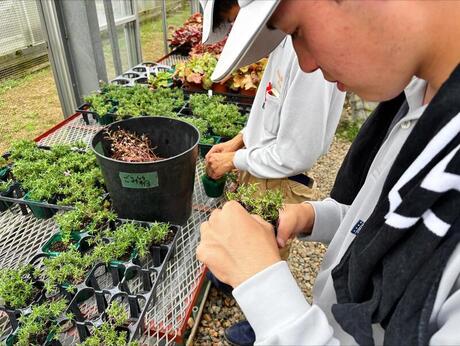 地元の園部小学校との交流に使用する「シバザクラ」の管理作業を行いました。 この花は小学校の花壇に植えます。