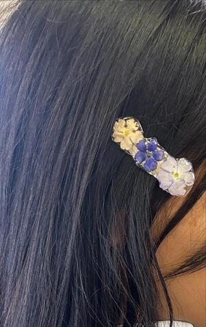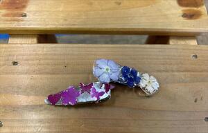「花を使った髪飾りを作りたい」 生徒の想いから、部活動でヘアピンを試作しました UVレジンでドライフラワーをコーティングしています。生徒の希望で、まずはバーベナ(左写真の右側)と型抜きをしたシクラメンの花びら(左側)を使って試作しました。 見た目や使いやすさを考え、花の配置を試行錯誤しながら完成しました。 よりきれいなものを作るため、試作を続けていきます
