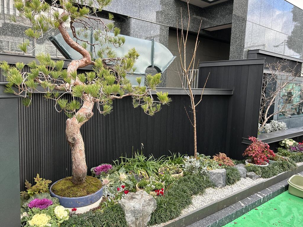 草花コースは玄関前の花壇を、造園コースはウェルカムガーデンを正月仕様に彩り、ホテルを訪れる方々に季節感を届けています。
