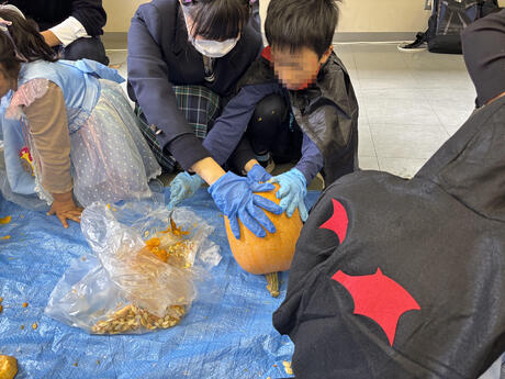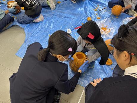 10月6日(金)、野菜コースが提供したサツマイモ苗で育てたサツマイモを、園部町の3園の園児約100名が収穫体験を行い、野菜コース2年生8名がお手伝いをしてきました。