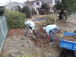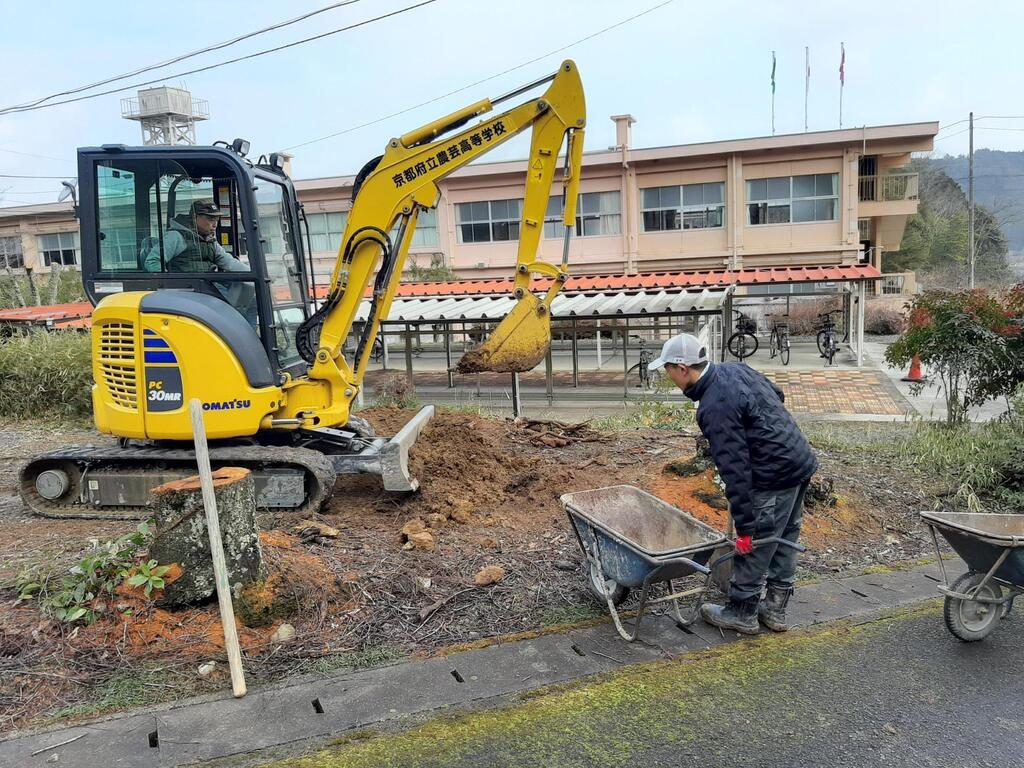 この庭は造園コースを3年前に卒業した生徒が作庭した「保津川」(テーマ)。この後、解体され今年の3年生が新しい庭づくりを始めます。どのようなものができるのか、楽しみです。