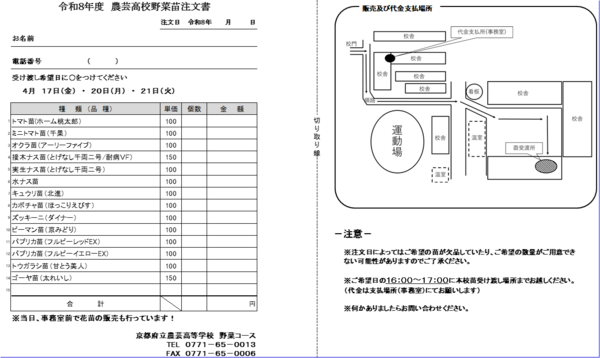 京都府立農芸高等学校(詳細な受渡し場所は、添付ファイルの地図をご覧ください。代金は、本校事務室にてお願いします。)