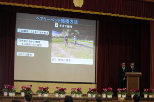 課題研究発表では、3年作物コース大豆班と3年生物工学コースから、それぞれ研究内容の報告が行われました。