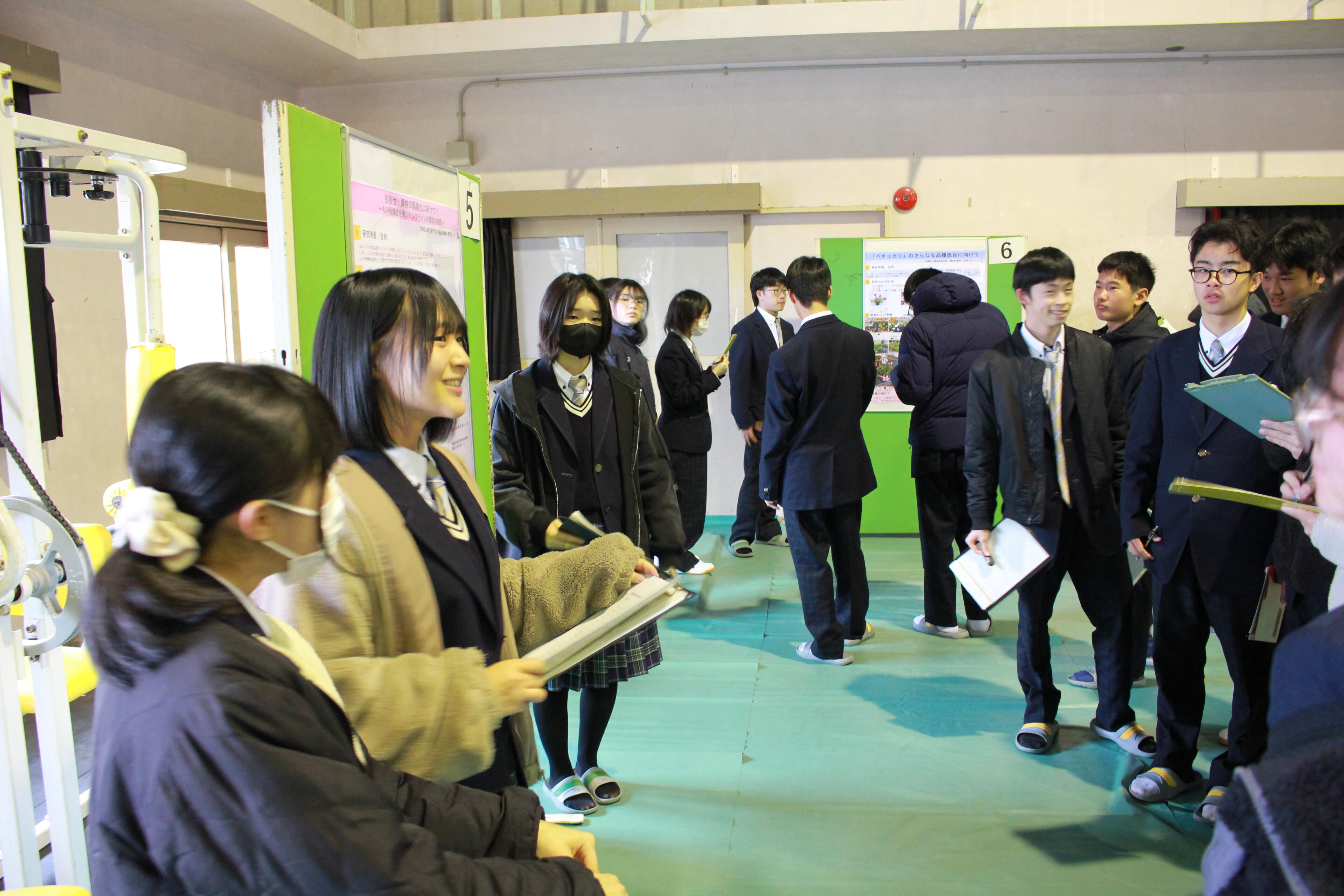 また、ポスターセッションでは、主に各コースの2年生が課題研究の成果をポスターにまとめ、わかりやすく説明しました。ご来賓の方々から多くの質問をいただき、3年生に向けてさらに高度な研究を目指す良い機会となりました。