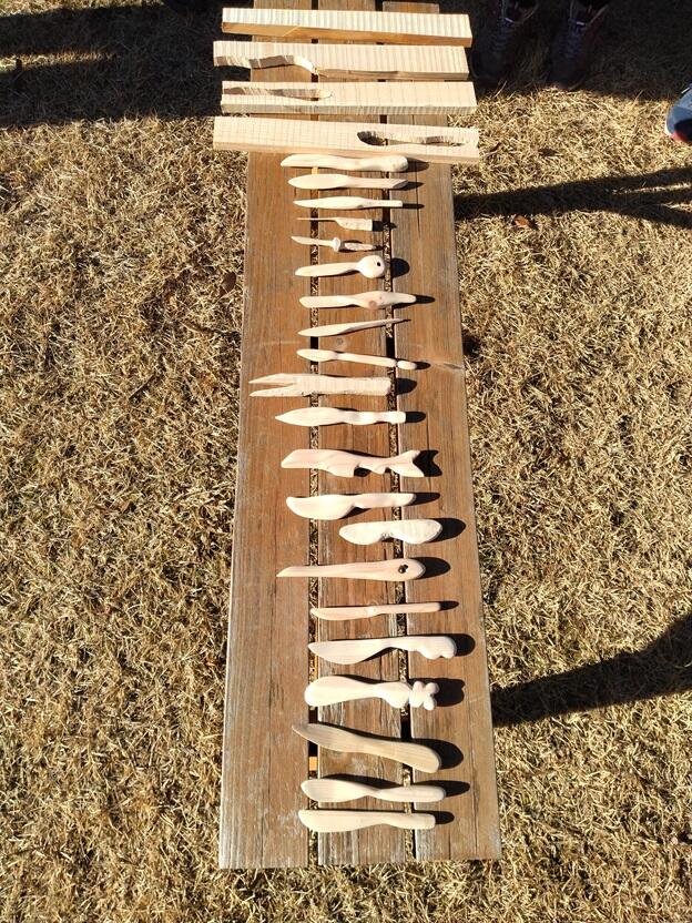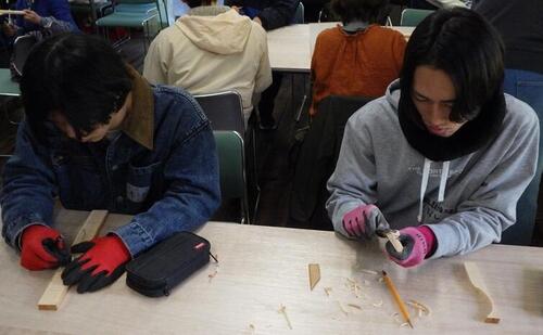 その後実習室に戻りそれぞれ板状の木材を選びバターナイフ作りに取り組みます。糸鋸でざっくりと形を整え小刀で調整し仕上げにヤスリがけ。檜の香りと木の感触、かたちが見えてくる楽しさに社会人も学生も昼食を取る間も惜しんで黙々と檜と向き合いました。それぞれ思ったかたちではなかったかもしれませんができあがったものが正解。それぞれ大満足で作業を終えることができました。