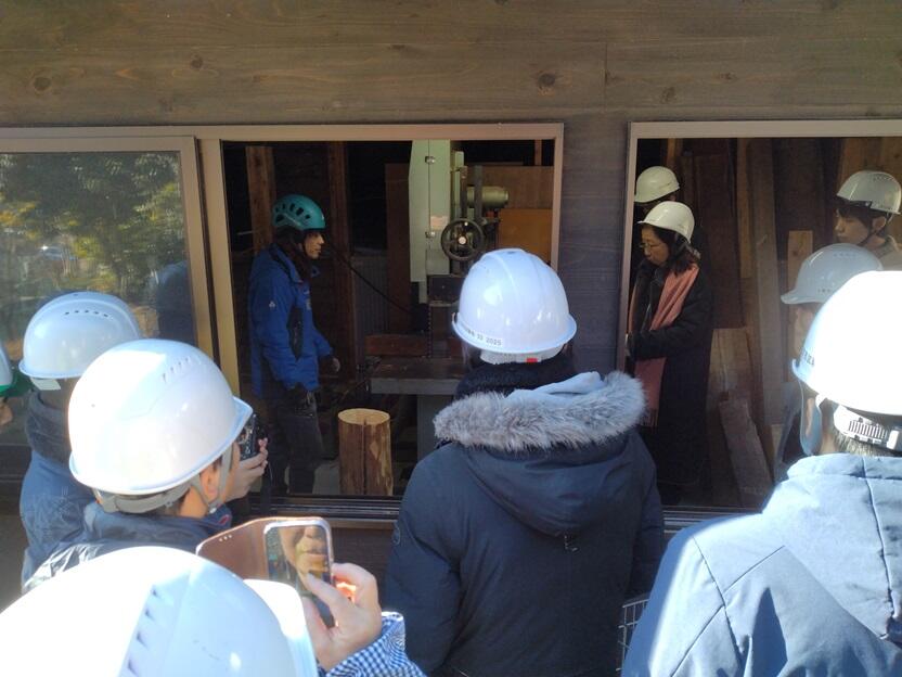 まずは木工室の見学から。立派なバンドソーをはじめいろいろな器具が並び試験地内のさまざまな木材も見ることができました。