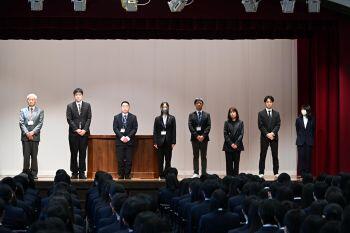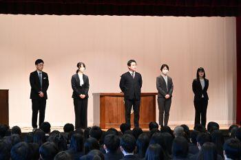離着任式では、離任された方のお名前を校長先生から紹介し、また、今年度着任された先生方が壇上に並び、生徒たちにご挨拶いただきました。