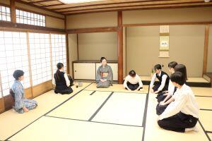 本校の正門と同様、五摂家の九条家からいただいた茶室と、広い和室が2つ、そして水屋があり、とても恵まれた環境でお稽古に励んでいます。また、フランス、アメリカ、台湾、中国など、海外からのお客様をお迎えしたり、京都府や諸機関からのご依頼で呈茶を行うなど、多くの方々にお茶に親しんでいただき交流する機会がたくさんあります。