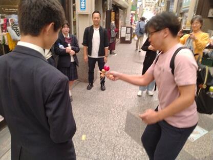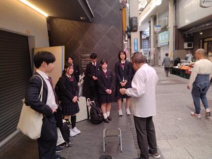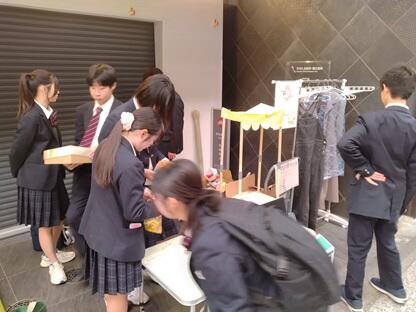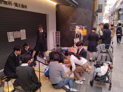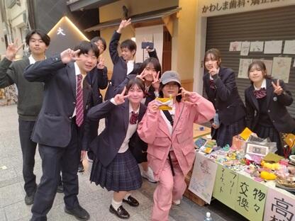 商店街と地元の高校生が協働して何かを生み出すというチャレンジ。一体何ができるのか?から始まってフリーマーケットはどうやろ?そもそも商店街で高校生が売れるものってあるか?ならお金を介さない物々交換ならいけるんちゃう?じゃあ商店街に交流の場を作り出すことを目指せば目的の一つ「商店街の活性化」に繋がるのではないか?と方向性が決まりました。折良く地元の西脇畳敷物店さんからいただいた"循環畳"が使えるのでは?広報はどうしよう?ポスターのデザインは?などなど本番に向けバタバタと動き始めました。結局は商店街の皆さんの温かいご協力に支えられて当日を迎えることができ、本番ではお客さんの優しさに支えられ無事に乗り切ることができました。生徒達は取り組むなかで生身の人間同士のコミュニケーションの難しさや楽しさ、自分の表現力の拙さ、それでも一歩踏み出せたことへの自信など一日の中でさまざまな感情と向き合い自らの課題と成長を実感したのではないかと思います。