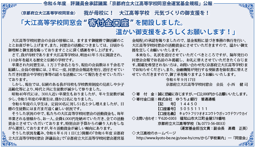 この度、大江高校同窓会 ”寄付金口座” を開設させていただきました。詳細は、添付ファイルを御参照ください。