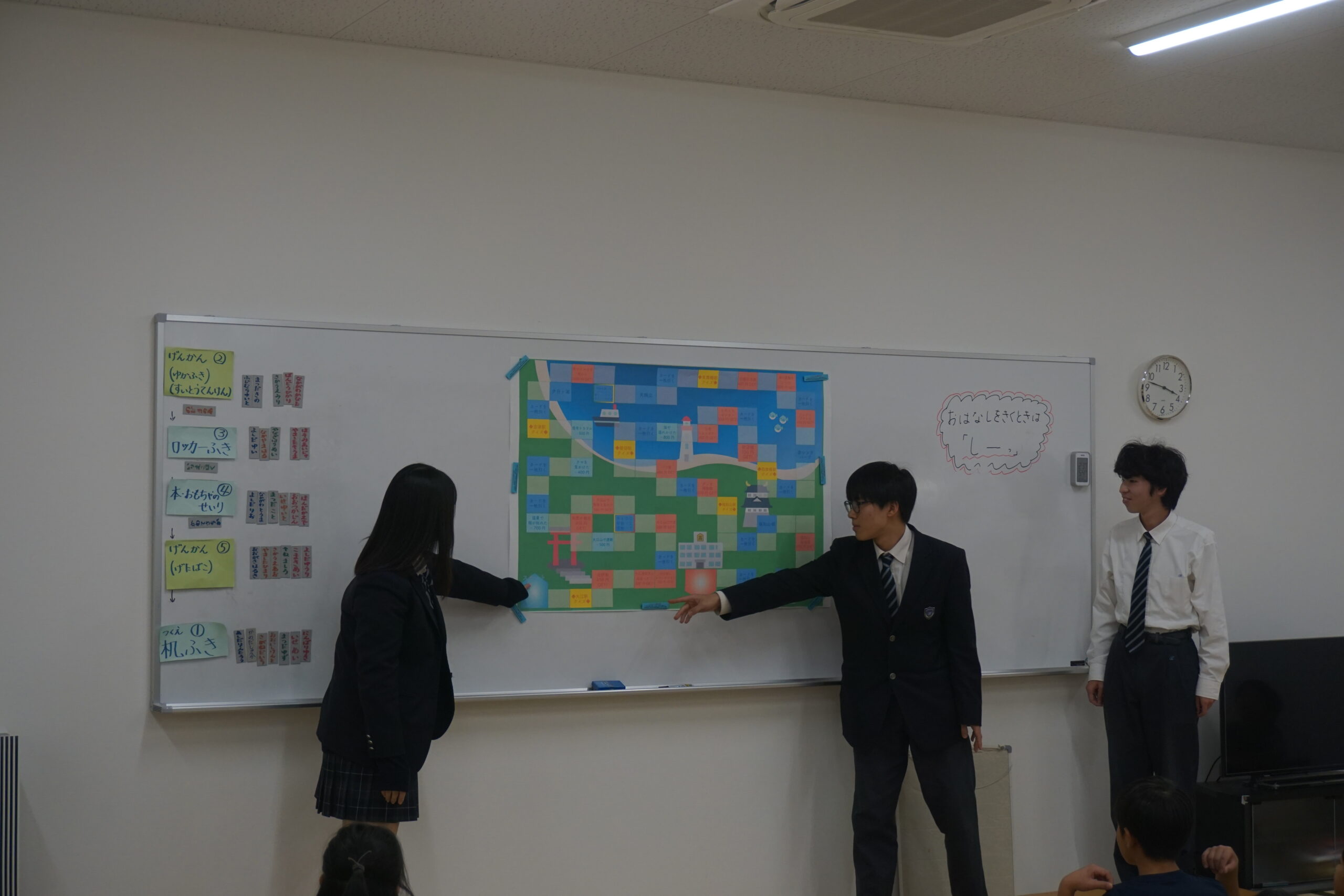 3年次生の総合的な探究の時間では、地域の魅力を発信するために、「映像デザイン系統でできること」を話し合い、オリジナルすごろくの制作に取り組んできました。そして、2年次生の協力も得て、実施することができました。