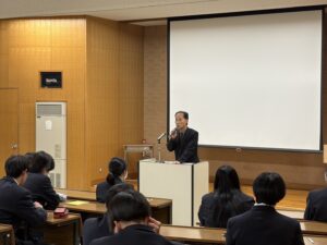 校長挨拶のあと、研修旅行委員長の挨拶、学年部長より研修旅行の注意事項等や諸連絡がありました。楽しく有意義な研修旅行にしましょう。