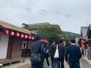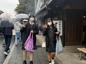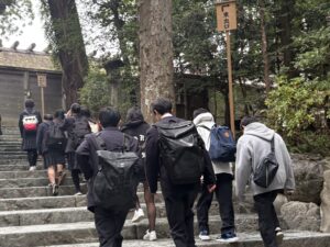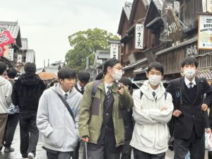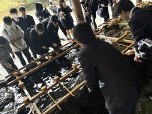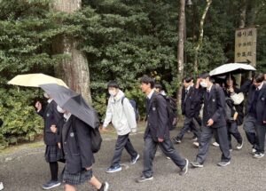 令和7年度研修旅行「伊勢神宮」に到着し、皇大神宮(内宮)にてお参りをしました。その後、神宮内及び「おかげ横丁」を自由に散策しました。少々雨が降っていましたが、食べ歩きをしたり、お土産を買ったりと、楽しむ姿が多く見られました。