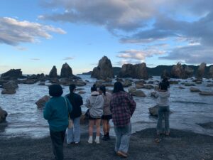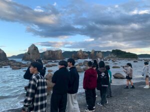令和7年度研修旅行「橋杭岩」へ到着しました。岩の並びが橋の杭のように見えることからこの名が付き、国の天然記念物とされています。日が沈む前の美しい景色を見ることができました。