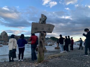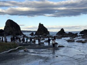 「橋杭岩」へ到着しました。岩の並びが橋の杭のように見えることからこの名が付き、国の天然記念物とされています。日が沈む前の美しい景色を見ることができました。