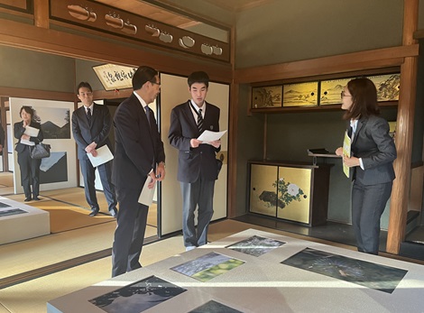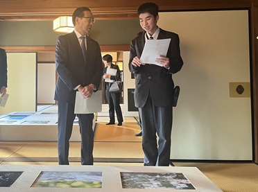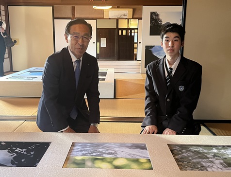 11月30日(日)まで、大雲記念館と大江駅で写真展「大江の物語ー変化(へんげ)する鬼たちー(主催:京都:ReーSearch実行委員会)」が開催されています。大江町の価値や魅力を再発見・発信するアートプログラムの一環で、本校地域創生科3年次生の横田 蒼貴さんも夏の写真ワークショップに参加し、一眼カメラを手に二瀬川渓流・宮津街道等を巡り、”鬼の気配”を探りながらシャッターを切りました。その中の2枚が大雲記念館と大江駅にそれぞれ展示されています。写真は、11月24日(月・祝)大雲記念館で来館された西脇 隆俊 京都府知事に写真の説明をしている様子です。「ワークショップに参加してどうだったか。」等、質問していただき、「写真の背景に”鬼の気配”を感じた。」と話していました。