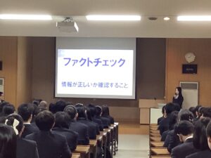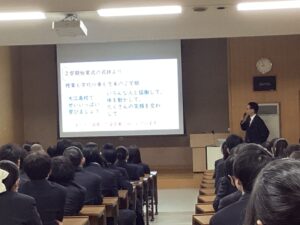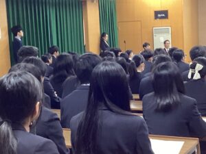 教務部長からはAIで作成した講話を読み上げた後、文章内の引っ掛かりを指摘し、AIを道具として使う際の留意点について話し、生徒指導部長からは来年変更になる自転車ルールのお話とともに改めて交通安全の大切さについて伝えました。