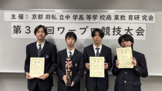 12月23日(火)「京都府私立中学高等学校商業教育研究会」主催の第38回ワープロ競技大会が行われ、経営情報系統2年次生が参加をしました。団体競技の部では3位、個人競技の部では2名が入賞しました。2026年5月の大会に向けてますます練習に...