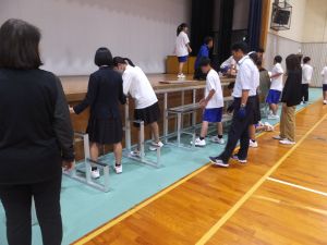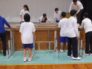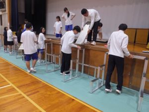 カルチャー・フェスティバルに向けて 大江学園のできごと 2025.10.20 11月7日(金)のカル・フェスに向け、中学生の役員が体育館にひな壇を設営しました。明日から小、中とも体育館練習が始まります。