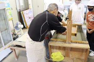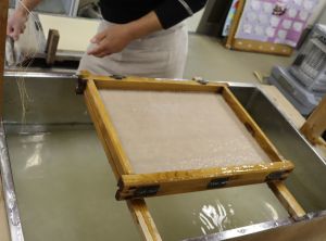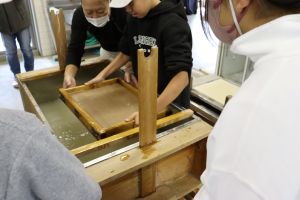 小6紙すき体験 大江学園のできごと 2025.11.25 6年生が田中製紙工業所(和紙伝承館)で紙漉きを行っています。今年は約10名ずつの3グループに分けて実施しました。この和紙は、4か月後に自身の卒業証書として手にすることになります。今から楽しみです。