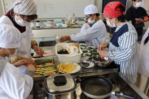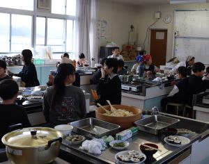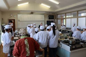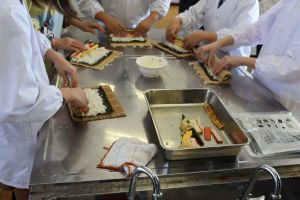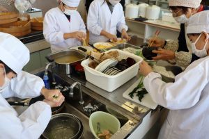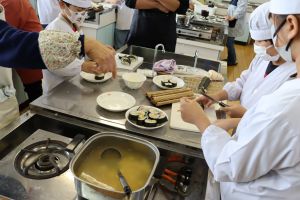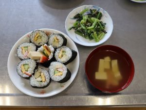 食の体験活動 大江学園のできごと 2025.11.26 11月21日(金)、京都府庁農林水産部、市教育委員会、市連合婦人会の皆様にお世話になり、5年生が「食の体験活動」を行いました。「巻き寿司」「青菜のごま和え」「すまし汁」を作りました。お出汁のよい香りと酢飯の甘酸っぱい香りが漂う中、婦人会の皆様に丁寧に教えていただき、三品ともおいしくできあがりました。