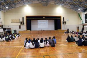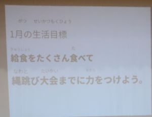 1月児童集会 大江学園のできごと 2026.01.15 1月14日(水)、1月の児童集会がありました。運営委員会が提案した生活目標は、「給食をたくさん食べて 縄跳び大会までに力をつけよう」です。そして重点委員会の保健給食委員会からは、「給食感謝週間」について担当の先生の話と、「給食もぐもぐ食缶クリーンキャンペーン」の提案がありました。
