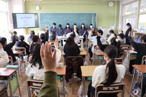 中学校進学ガイダンス 大江学園のできごと 2026.02.16 2月13日(金)、中学1年生が、小学6年生に「中学校進学ガイダンス」を行いました。同じ校舎とは言え、小学生にとって、中学校生活は未知の世界です。6年生から事前に質問アンケートを採り、班ごとに回答していきました。中学1年にとっても、自分たちの生活を振り返るよい機会になりました。