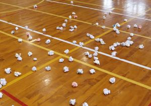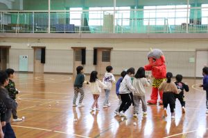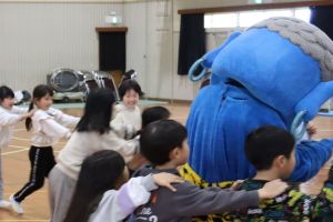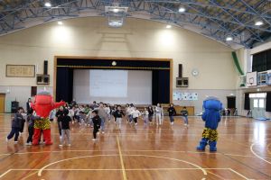 鬼 来る! 大江学園のできごと 2026.03.13 3月9日(月)、小学1年、2年のもとに、大江山から赤鬼と青鬼がやってきました。本来は2月3日にやって来る予定だったのですが、大雪で山から出られなかったそうで、今になってしまいました。子どもたちは、紙に自分が直したいことを書いて丸めた「まめ」を鬼にぶつけ、心をきれいにしました。その後は、鬼たちと○×クイズやじゃんけん列車を楽しみ、鬼と仲良くなりました。